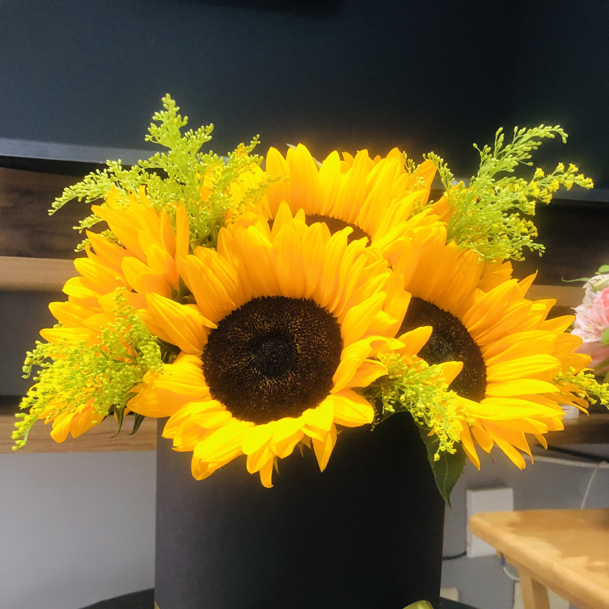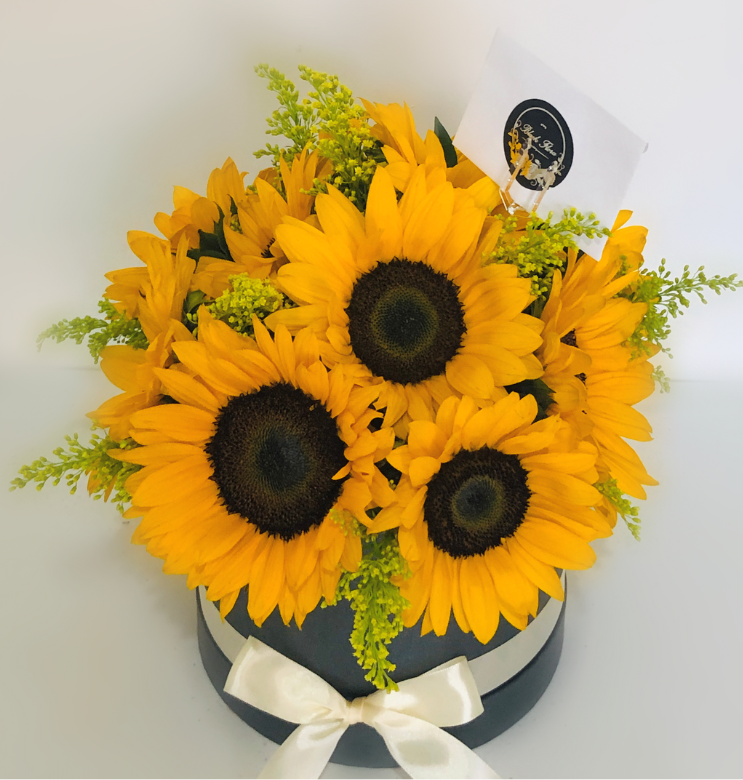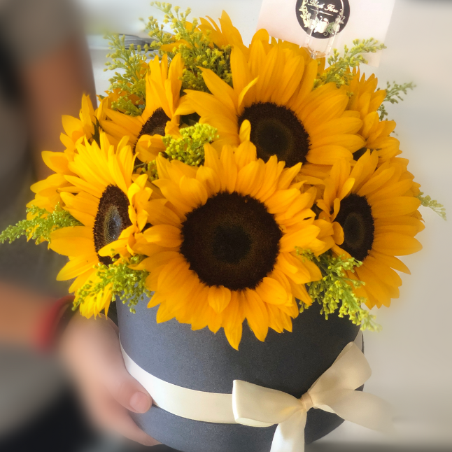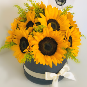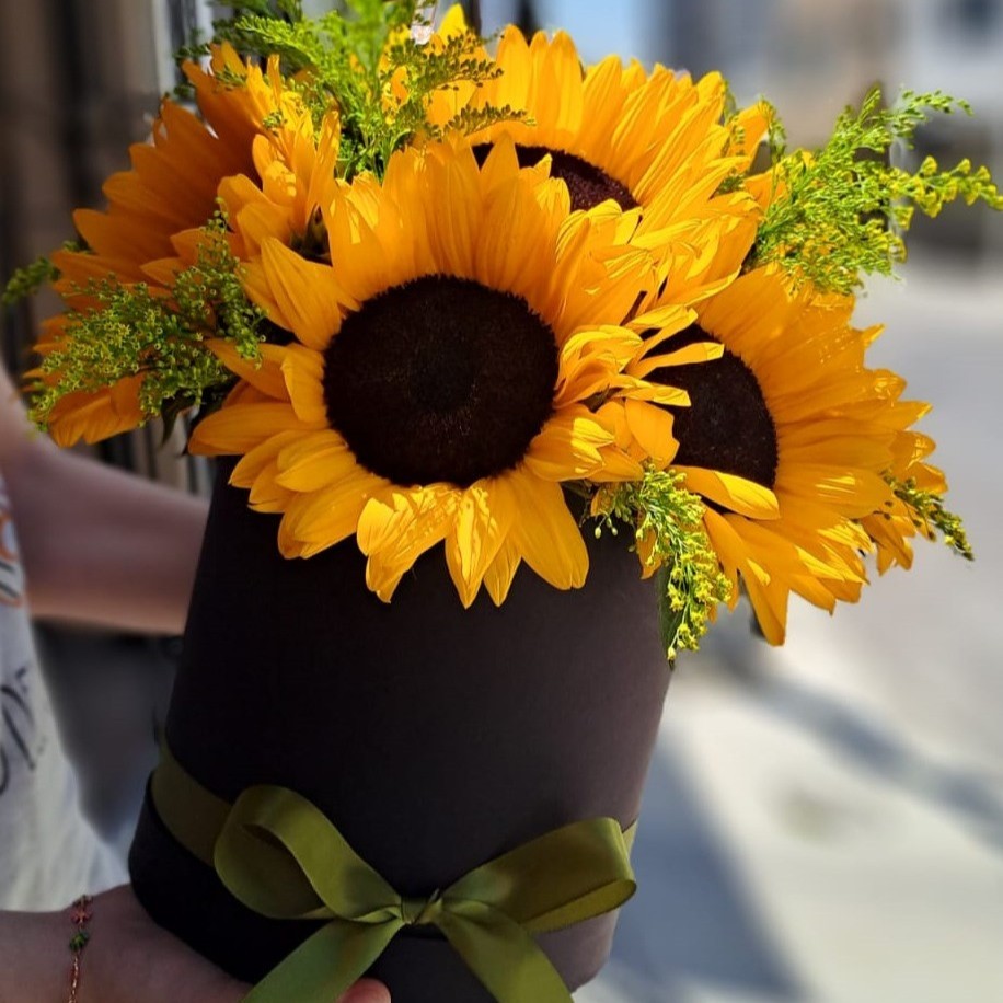 Arreglo con girasoles, solidago y follaje en base cilíndrica.