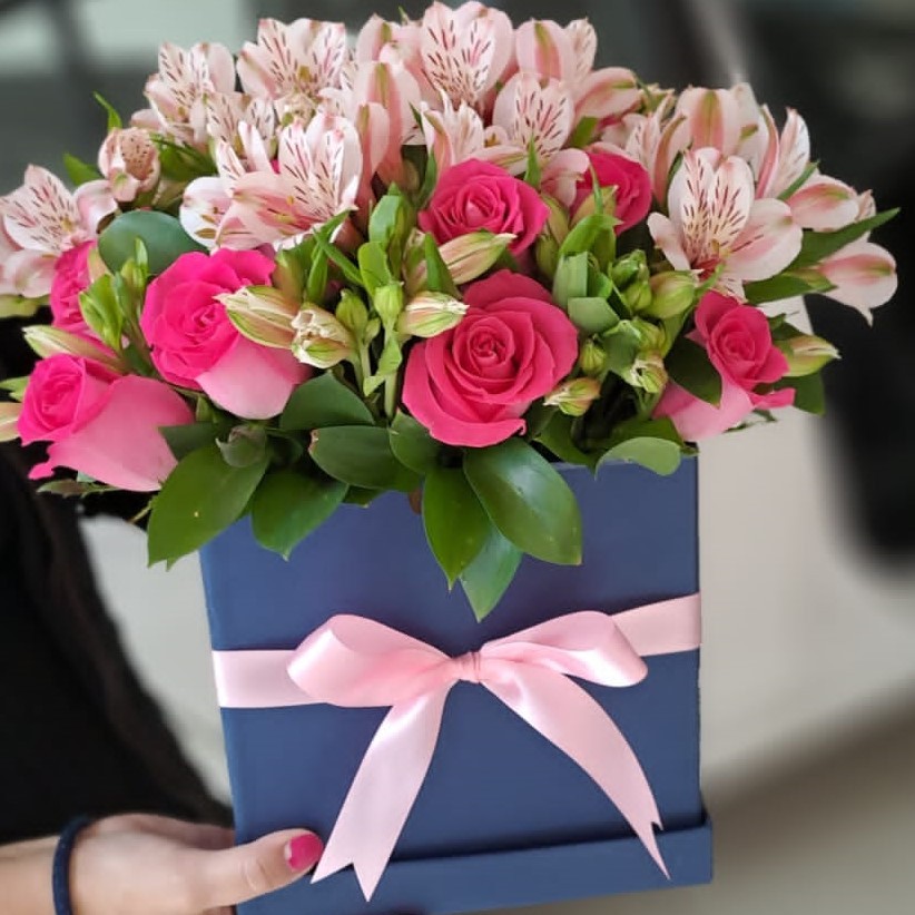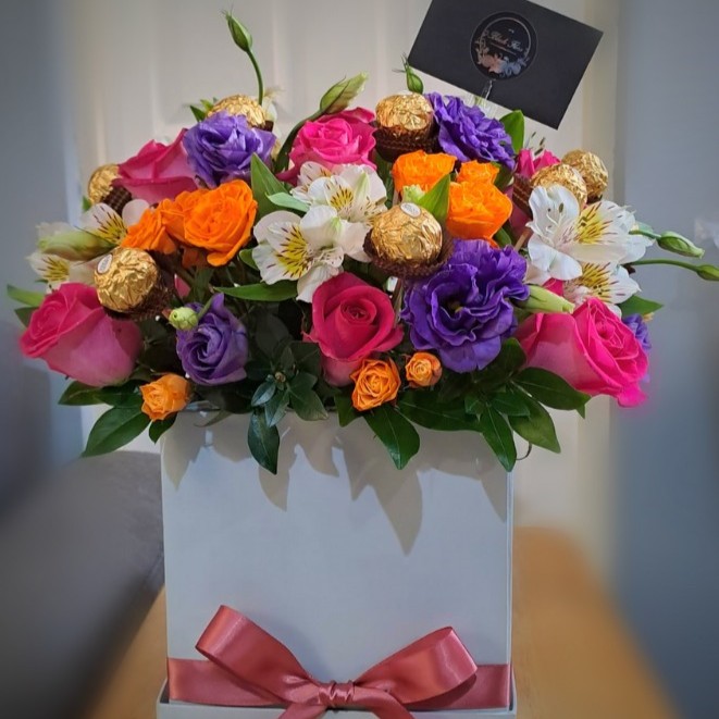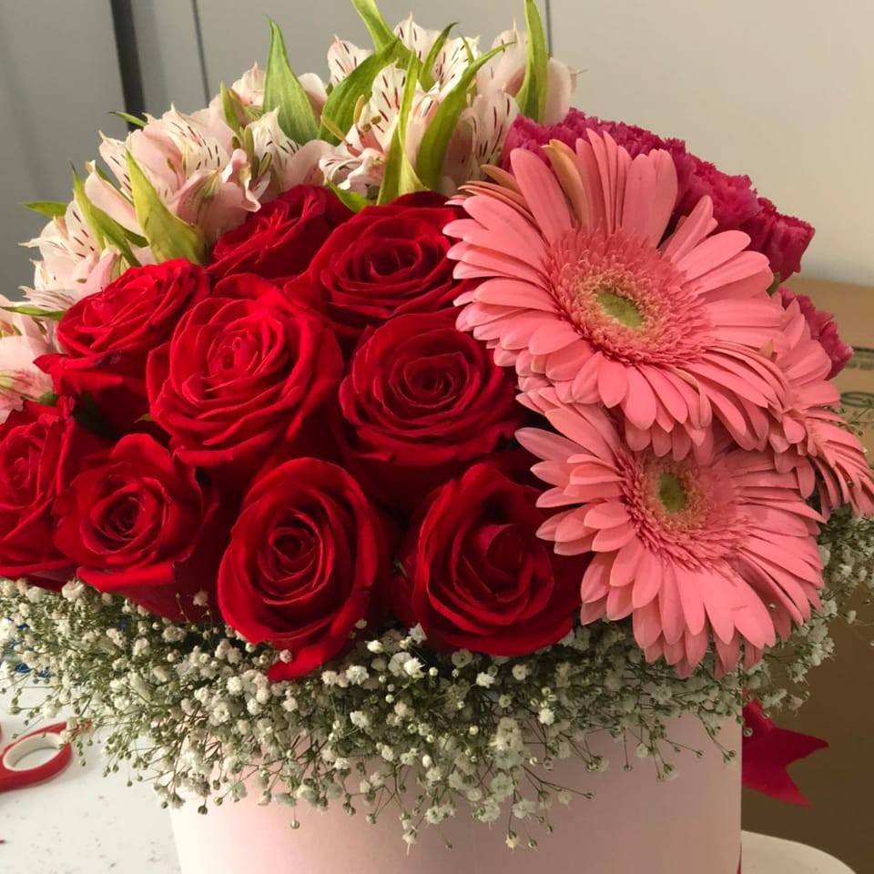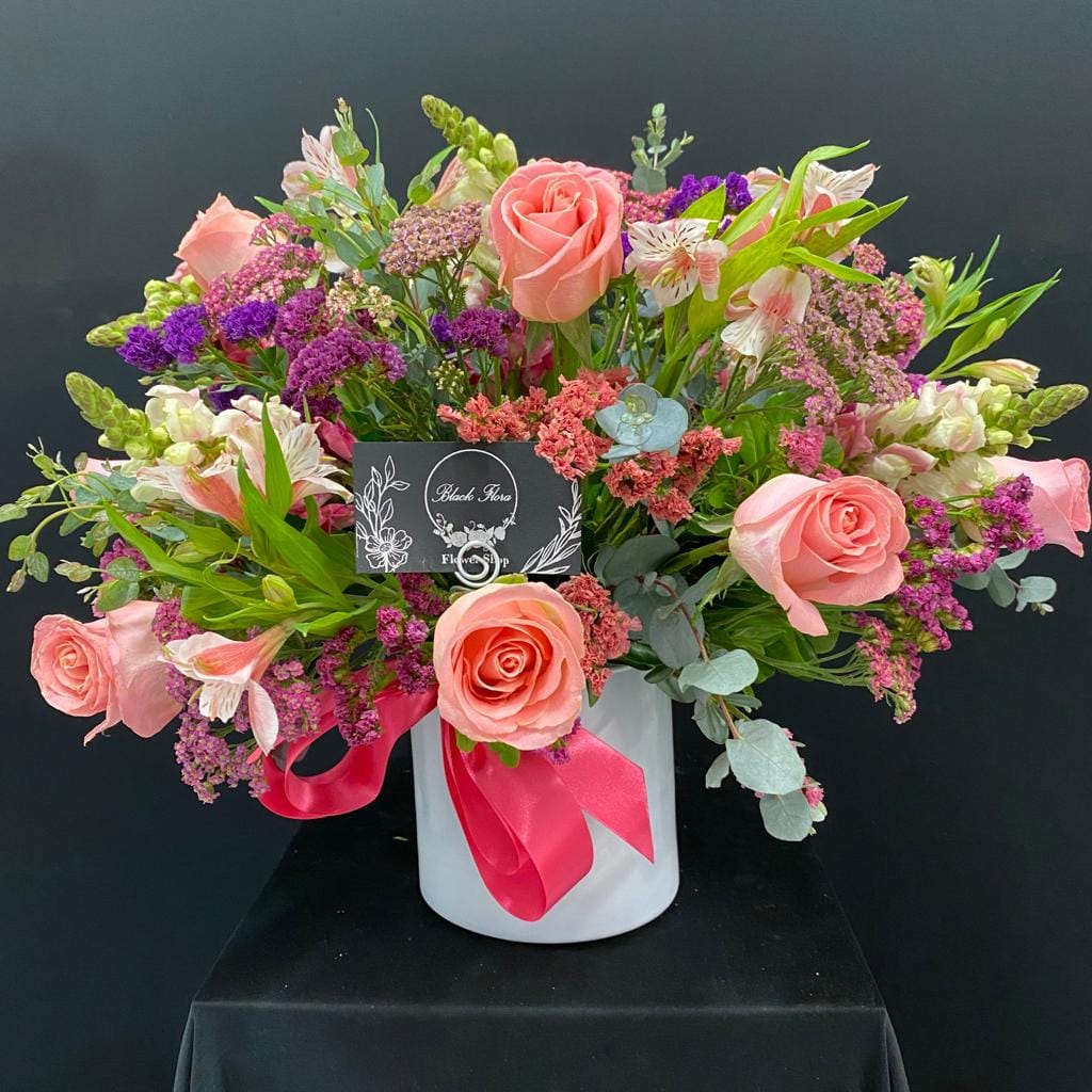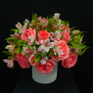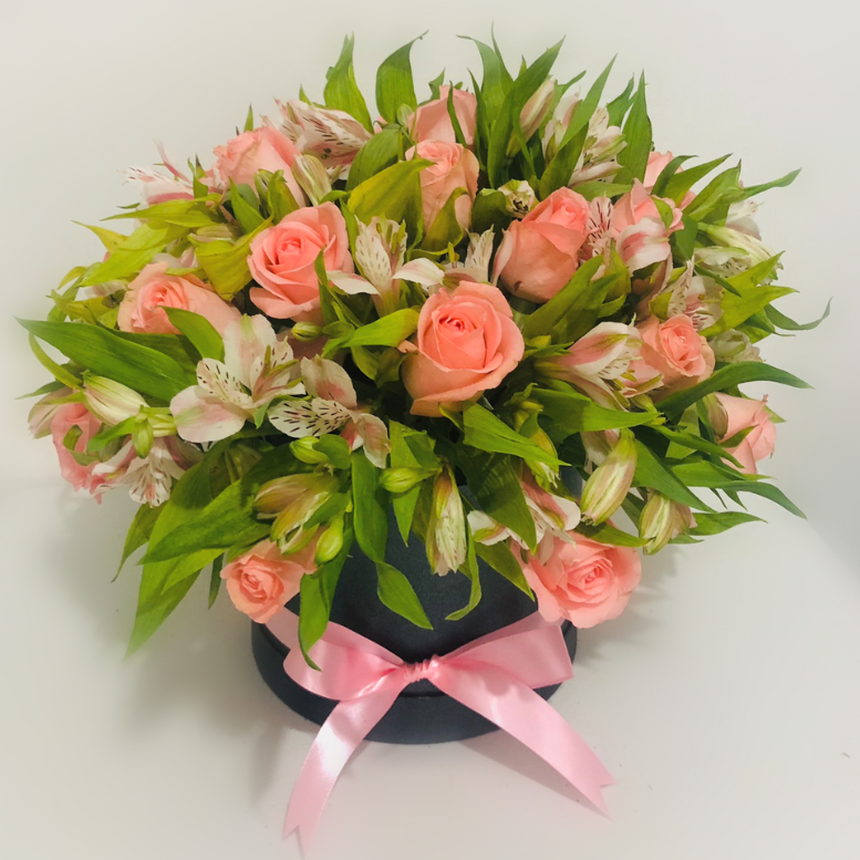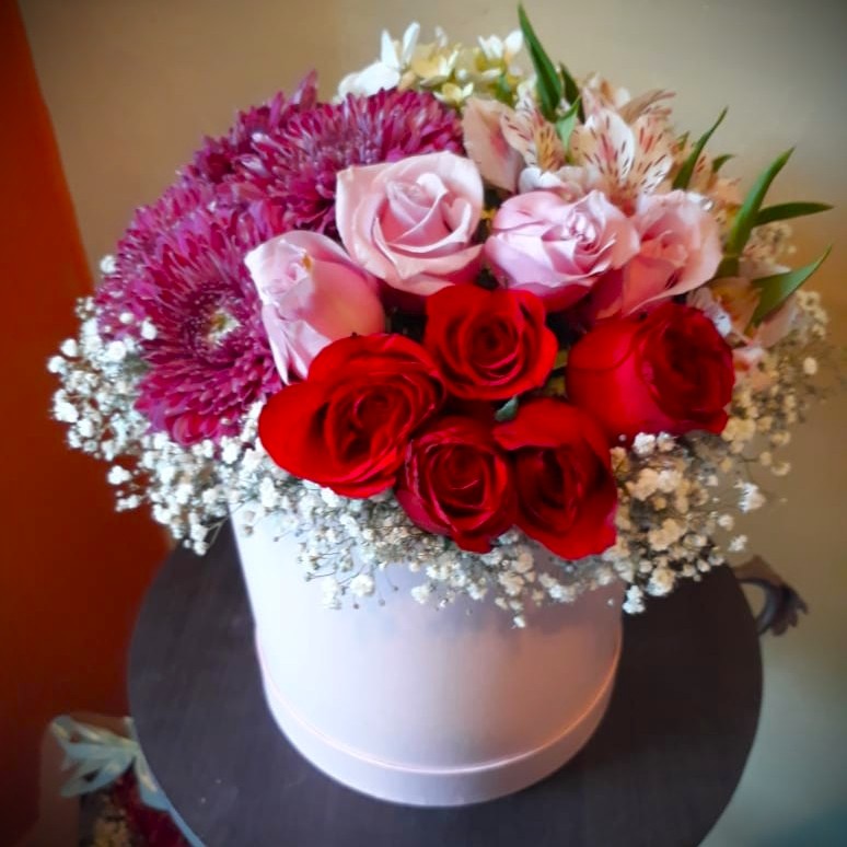 Arreglo floral redondo con rosas y astromelias en base de cerámica o caja. Con opción chocoloates