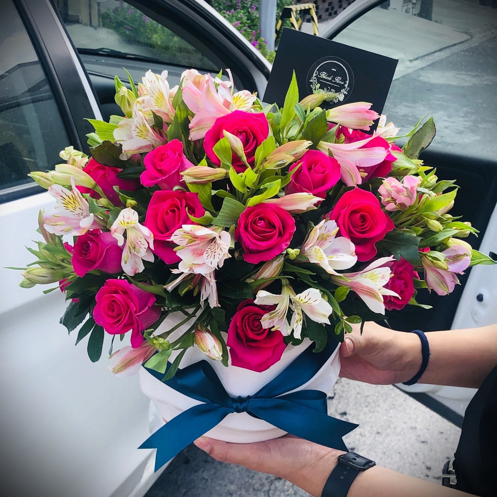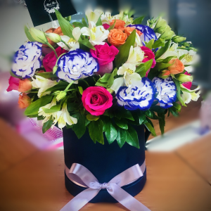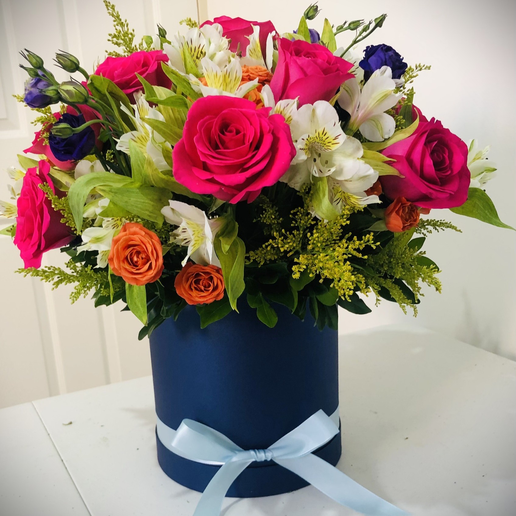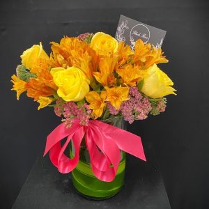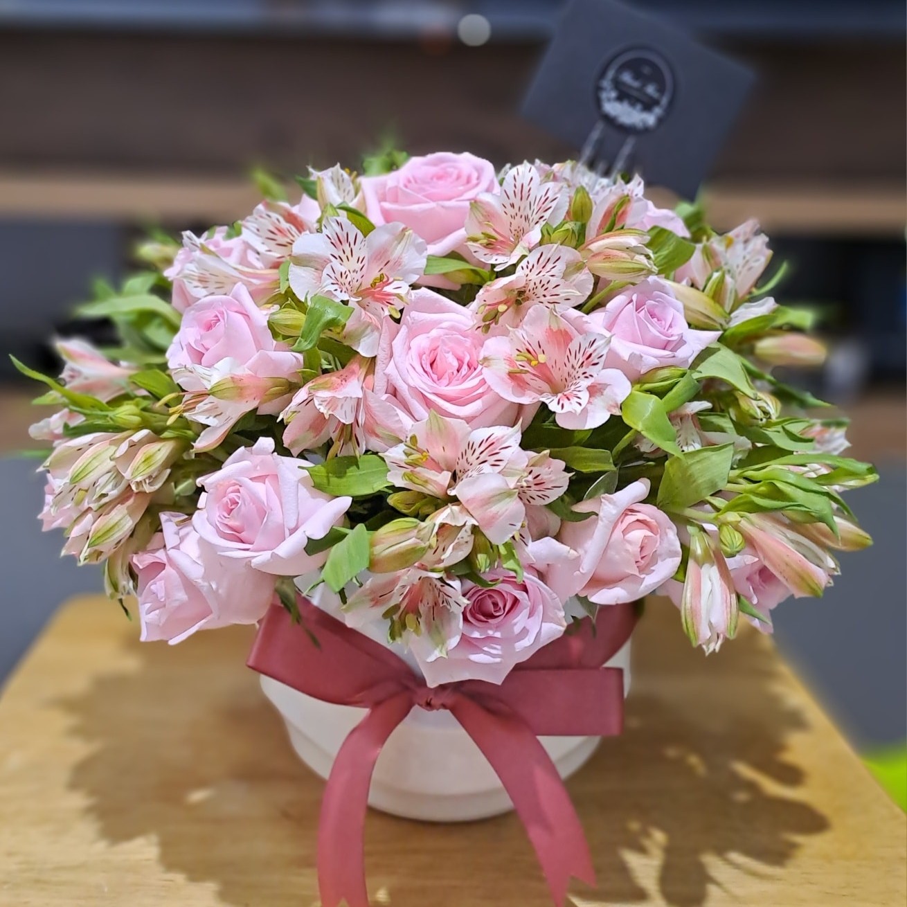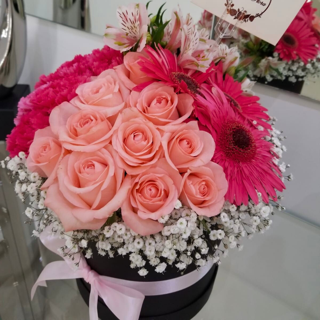 Arreglo floral redondo con rosas y astromelias en base de cerámica o caja. Con opción chocoloates