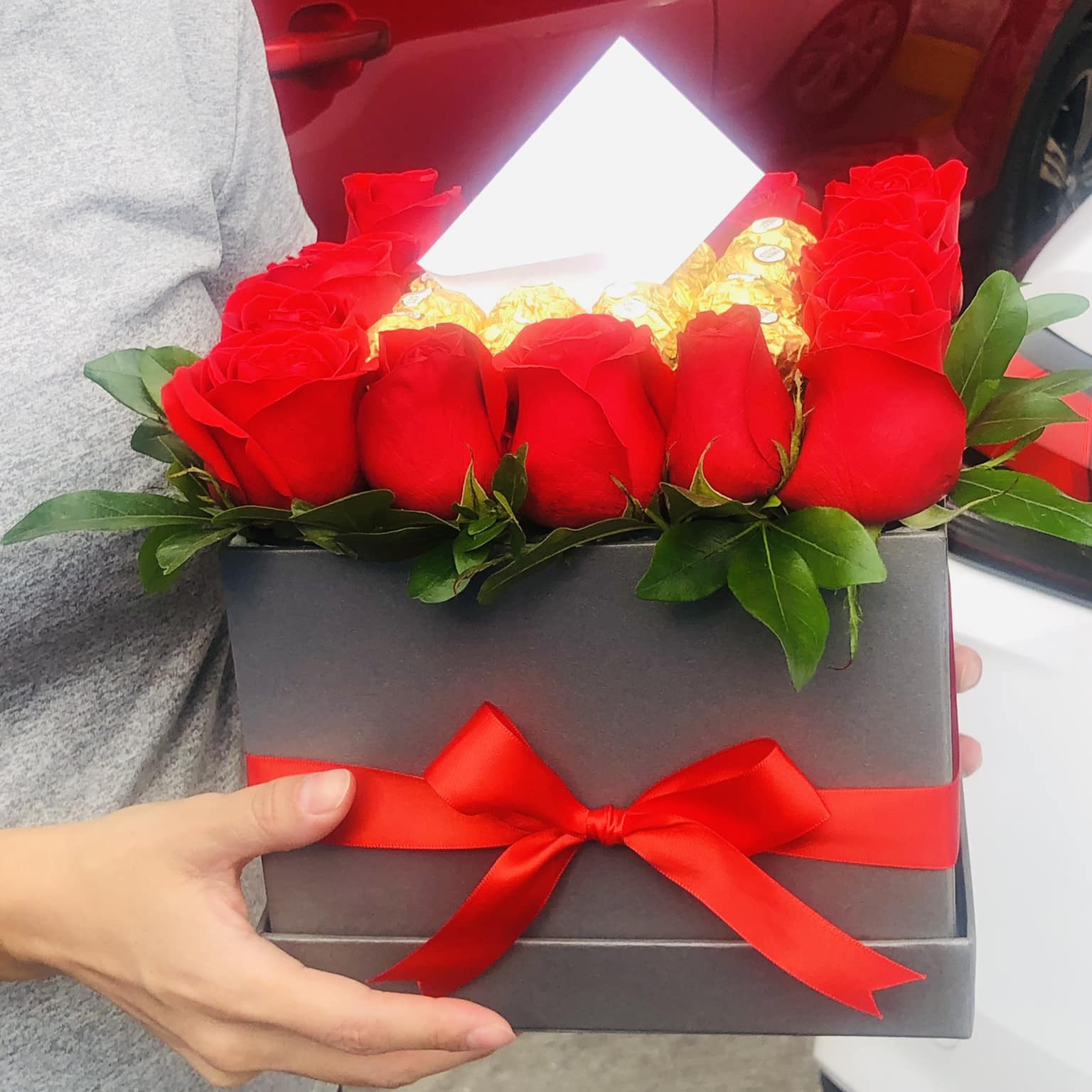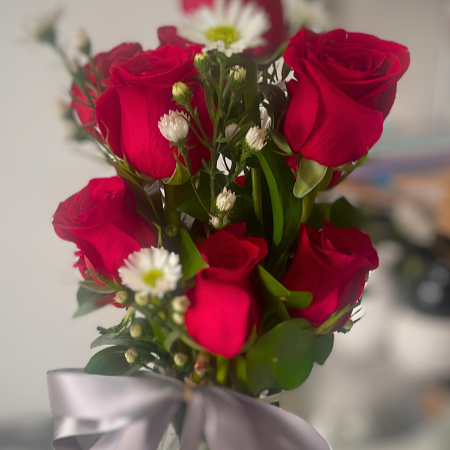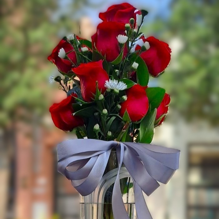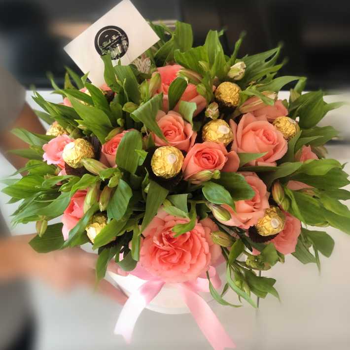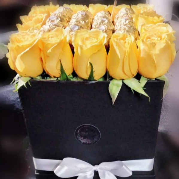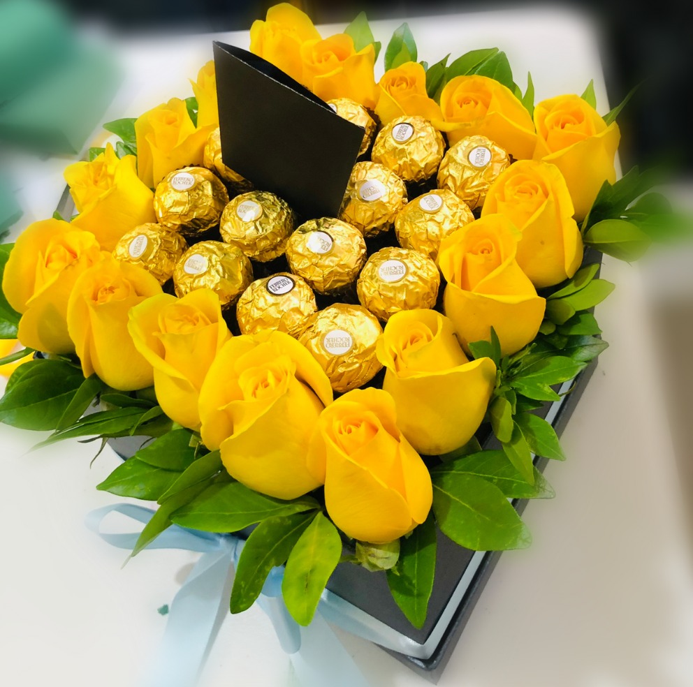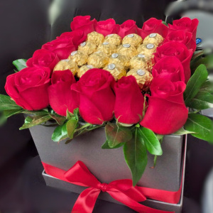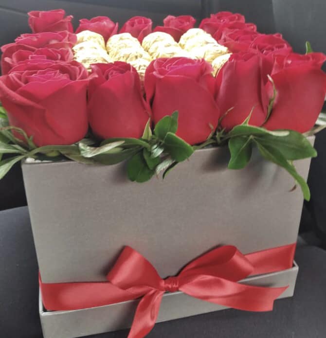 Base mediana con rosas y chocolates, o solo con flores.