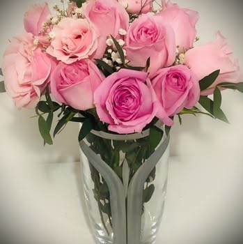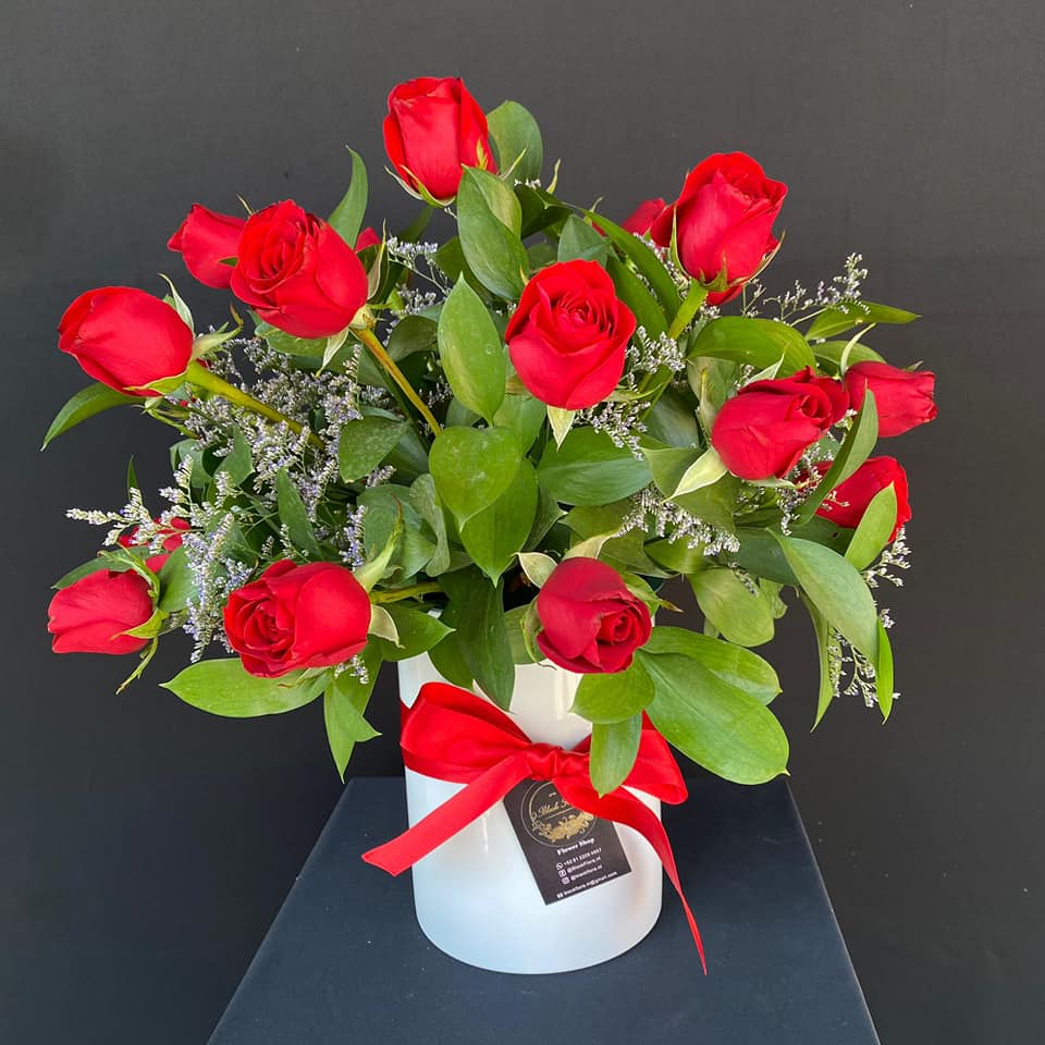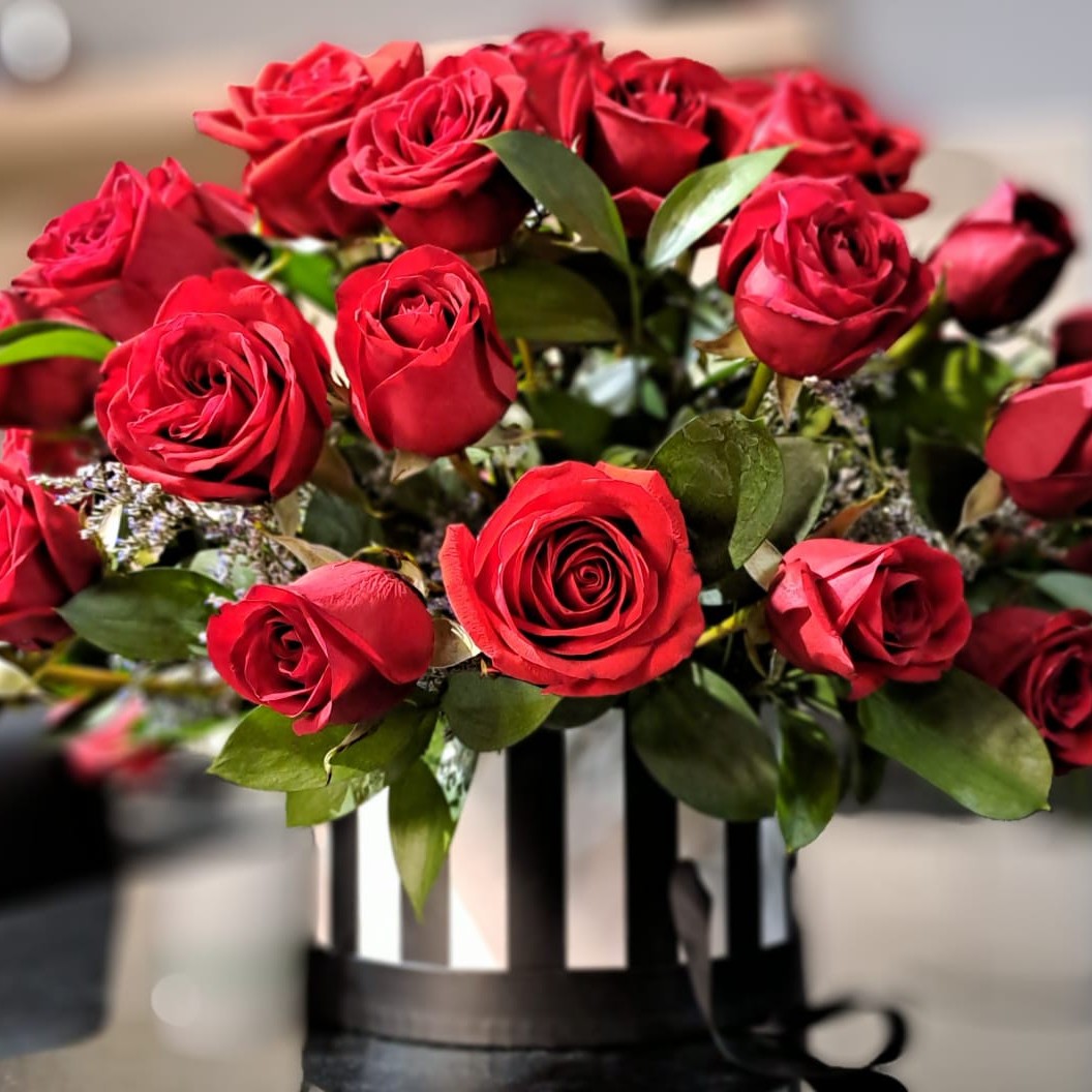 Arreglo floral con 24 rosas, limonium y follaje.