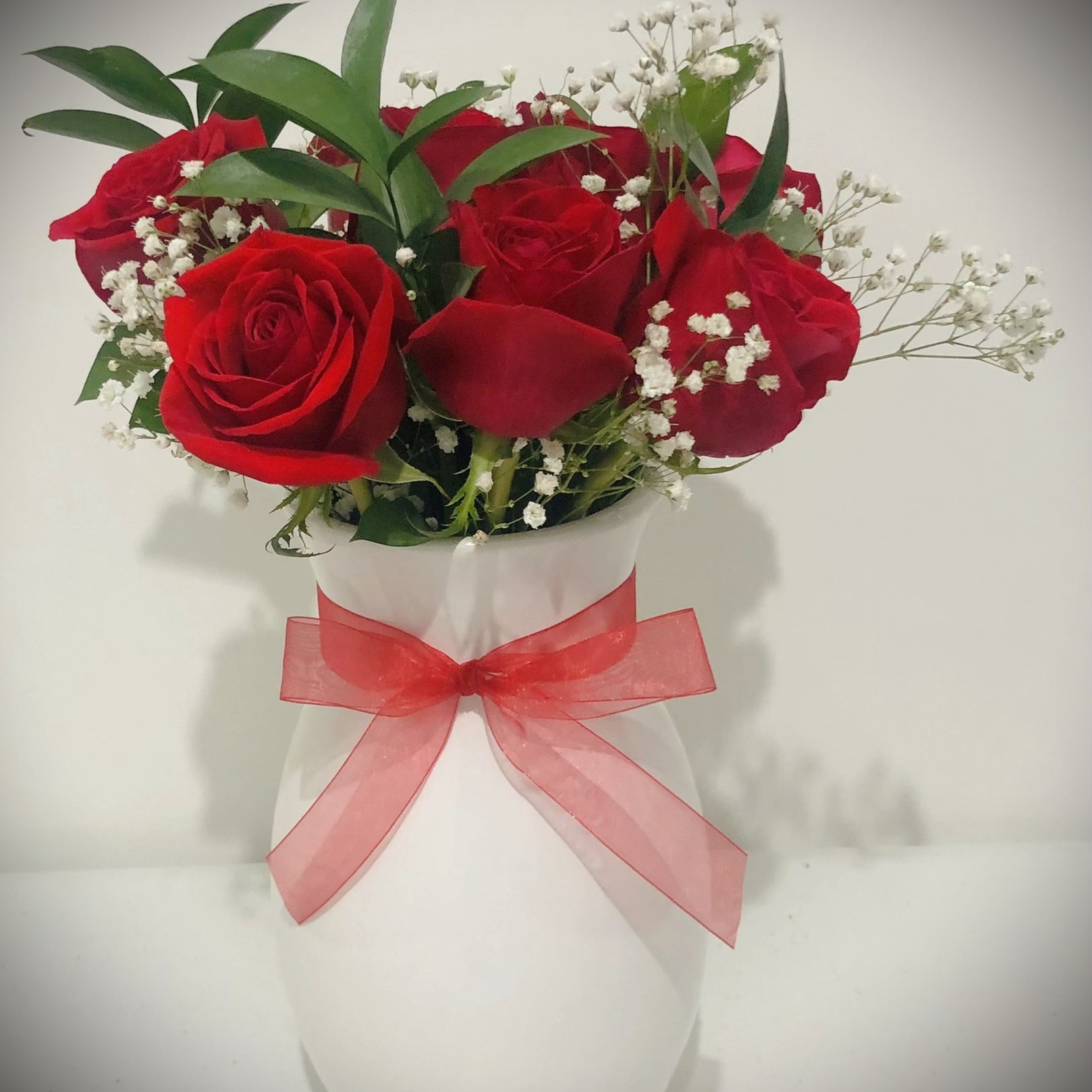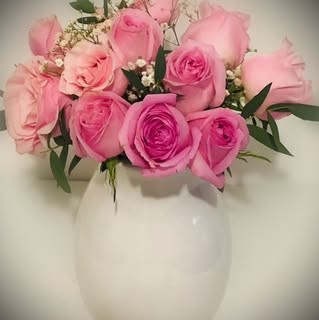 Arreglo de rosas con follaje en base de vidrio o cerámica.