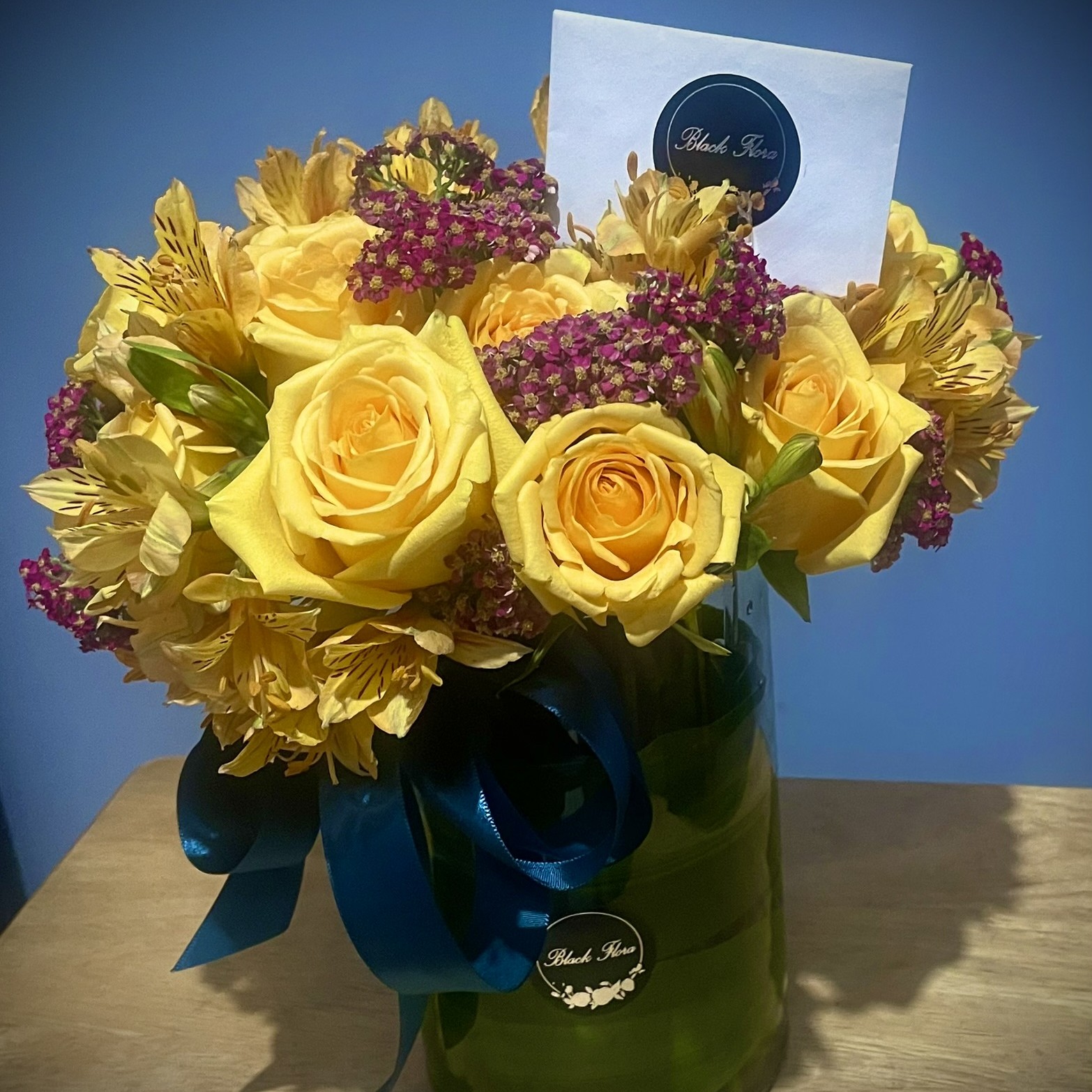 Rosas hummer con astromelias y alquilea.