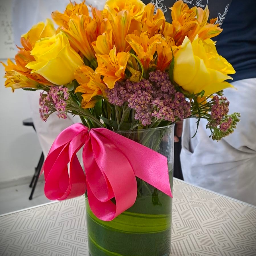 Arreglo grupal de flores con rosas y gerberas.