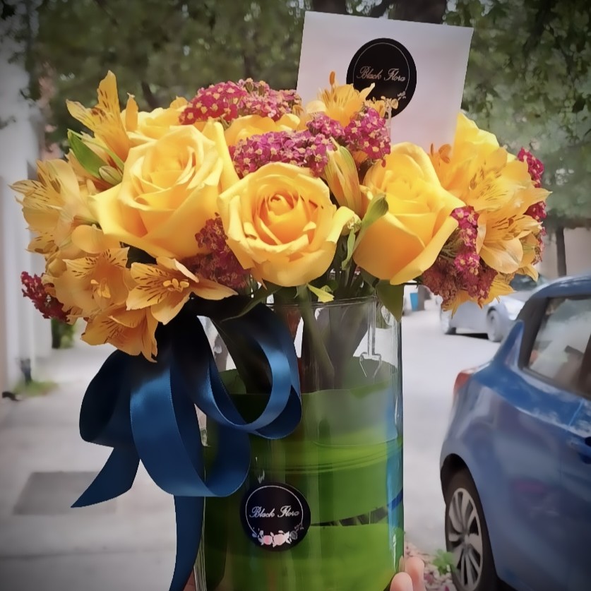 Rosas y astromelias en base