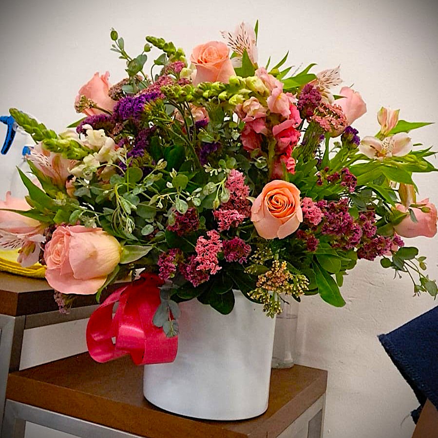 Rosas con statice, astromelias y boca de dragon.